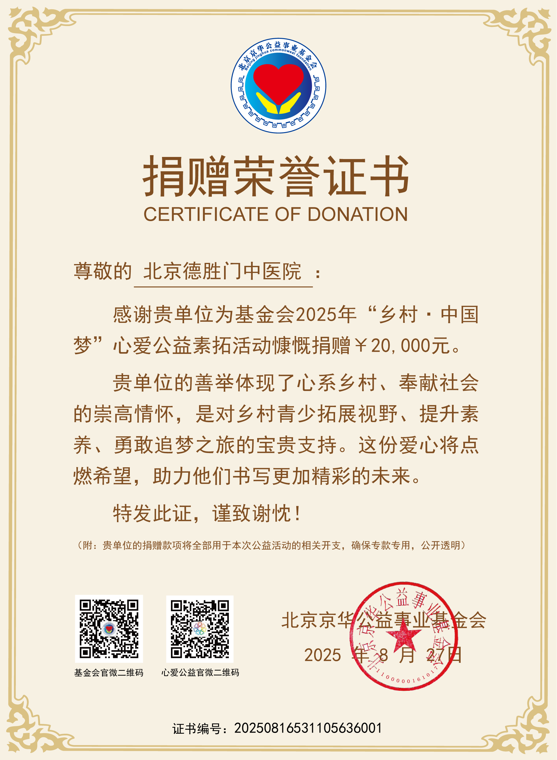 近日,北京德胜门中医院积极践行社会责任,为基金会2025年“乡村·中国梦”心爱公益素拓活动慷慨捐赠善款20000元。这一善举如同一束温暖而明亮的光,照亮了乡村青少年追逐梦想的道路。北京京华公益事业基金会授予北京德胜门中医院捐赠荣誉证书,以此表彰这一充满爱心的善举。
