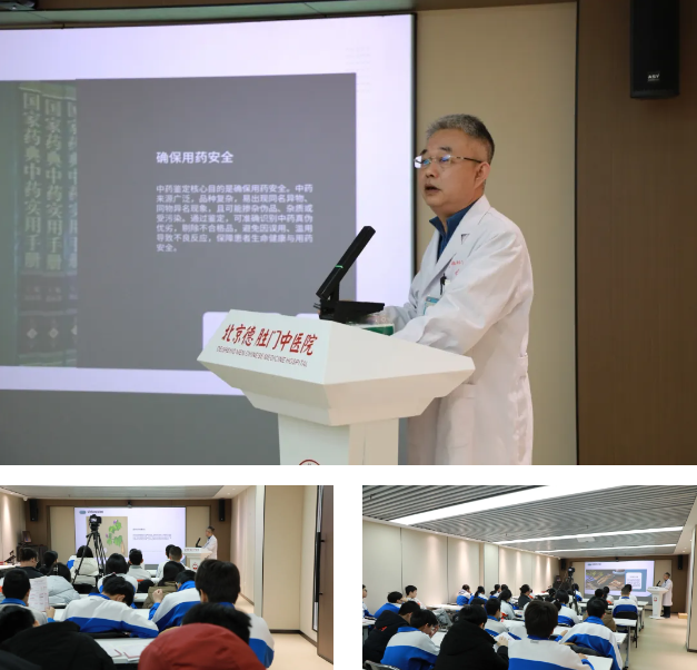 北京德胜门中医院药房李涛主任为同学们精心准备了“中药识趣课堂”。他带领大家认识常用中草药标本,学习常见中药的鉴别与使用方法。这堂课不仅帮助大家认识了多种中药,也为今后进一步了解中医药文化奠定了基础。